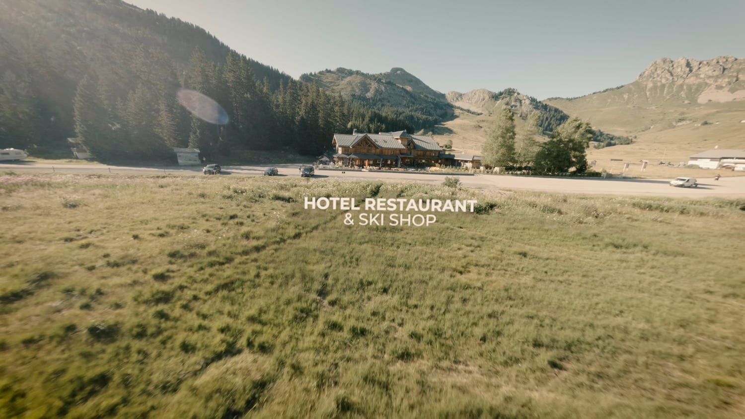 Le drone poursuit sa descente, glisse à travers les larges baies vitrées, et nous fait entrer à l’intérieur du restaurant et de l’hôtel. L’ambiance change, mais la magie demeure : bois chaleureux, esprit chalet familial, convivialité et gastronomie locale.